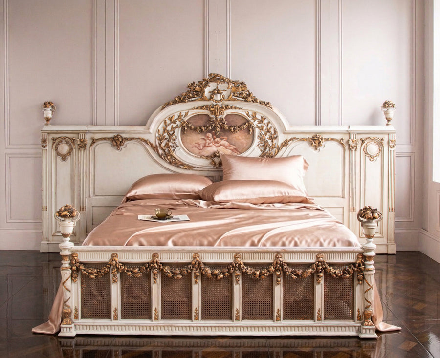 19th C. Neo Classic Large Bed With Gilt Work & Painted "Boucher" Style Cherubs