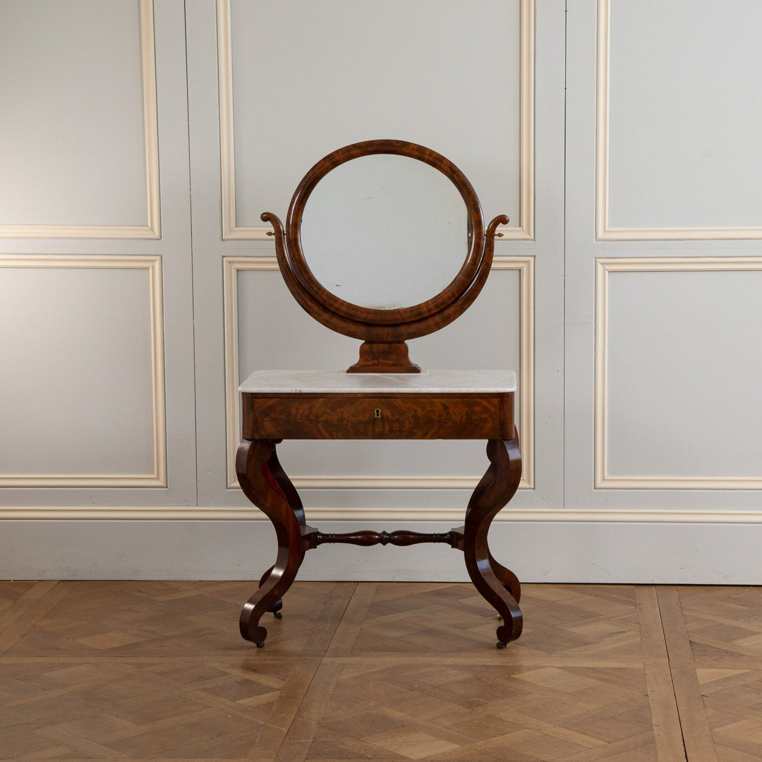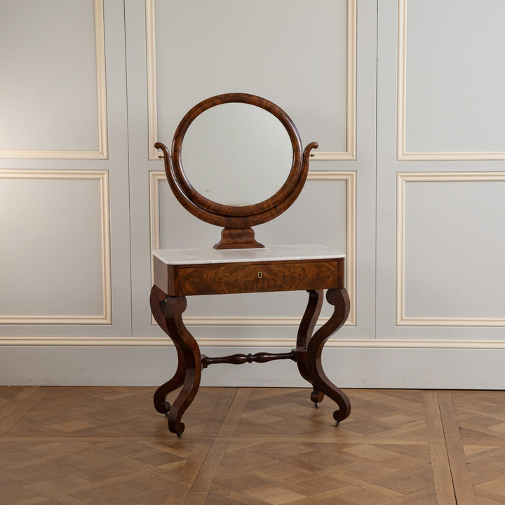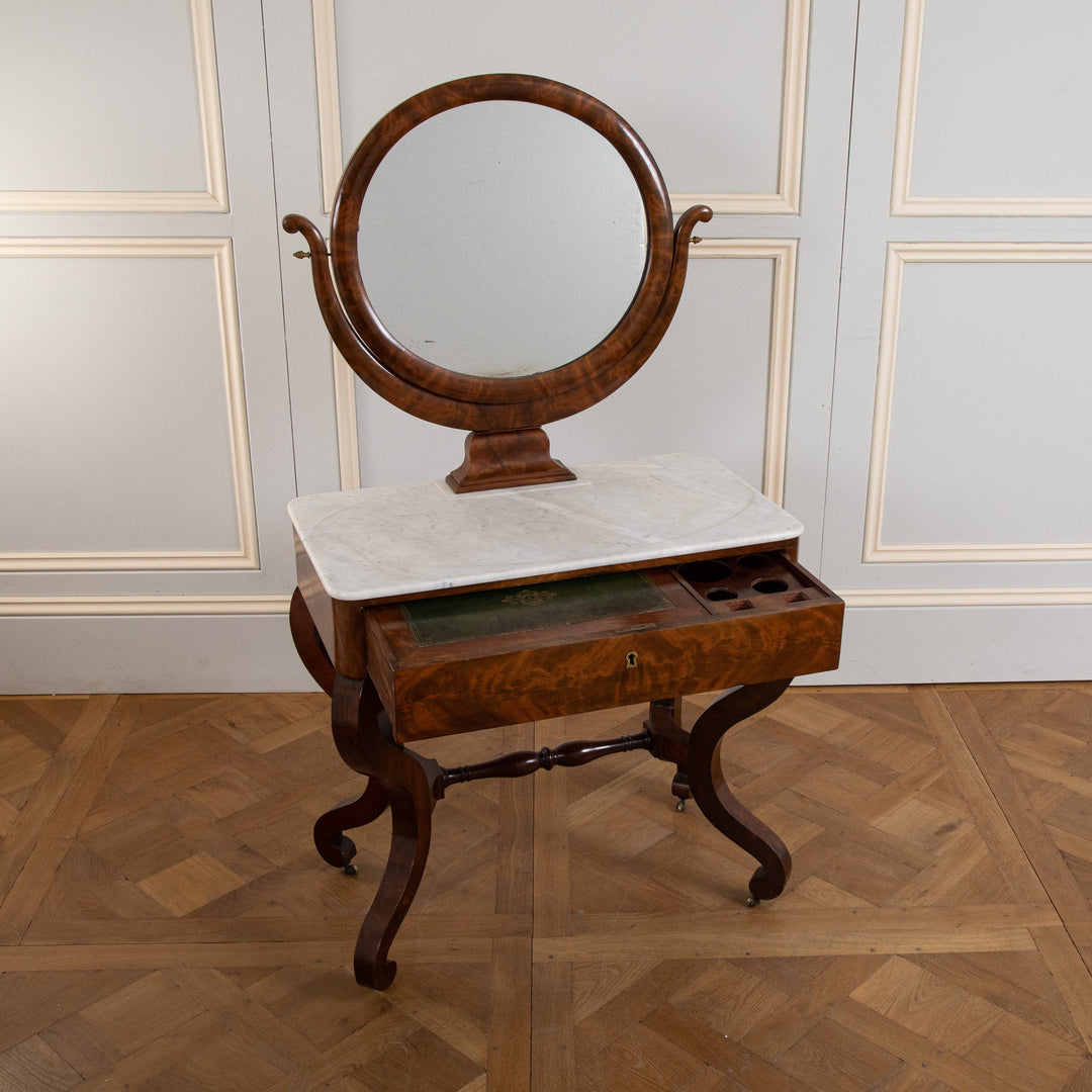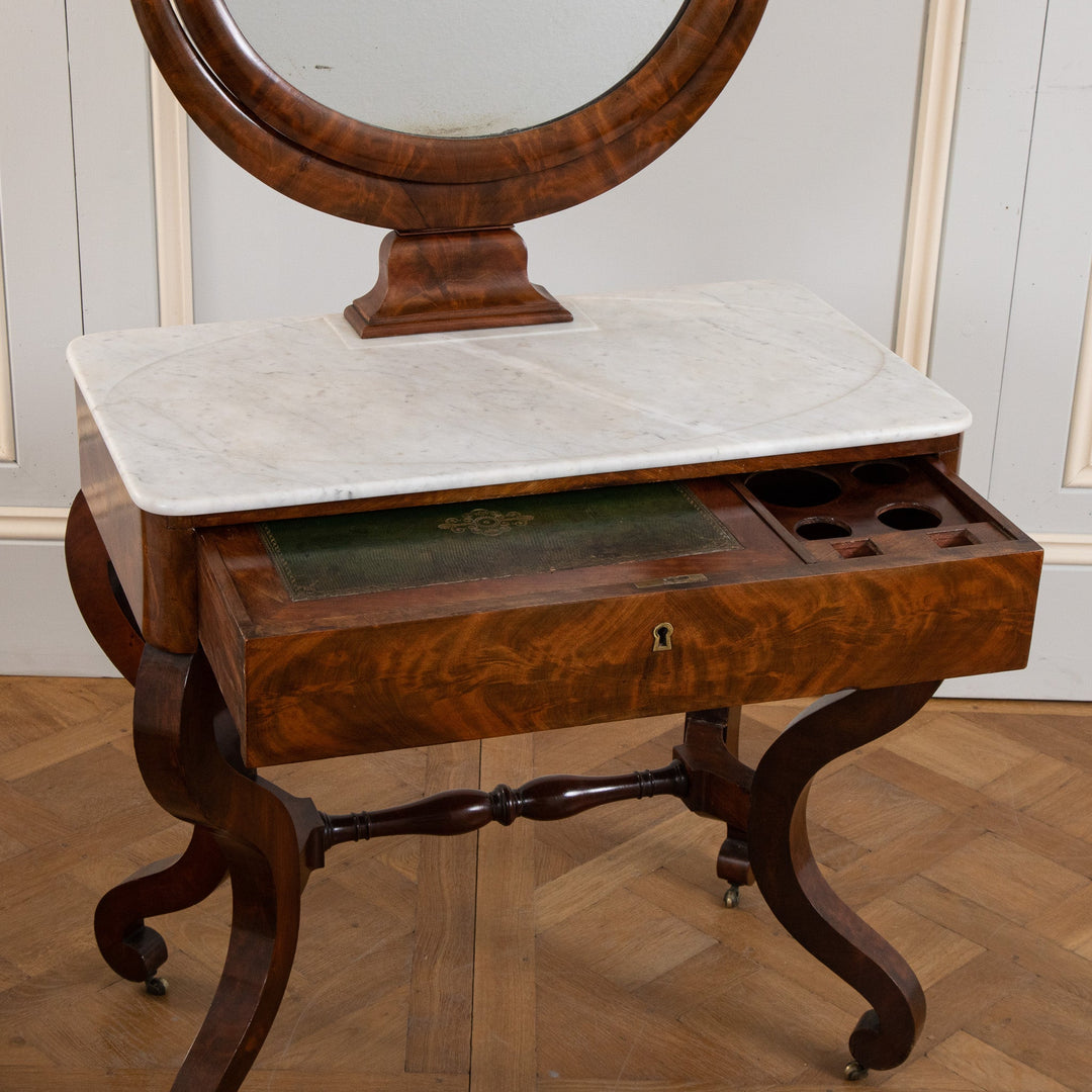 An elegant French Mahogany dressing table from the restauration period (early 19th Century). Seating on 4 Shapely feet has a Marble top with a round Mirror. The drawer has a leather top which was used as a writing table.