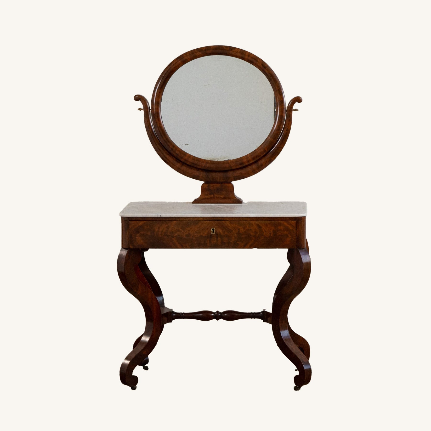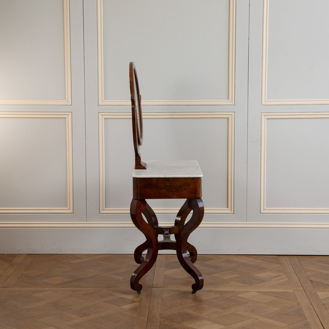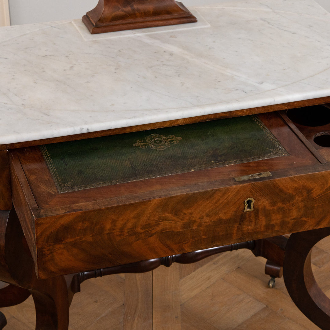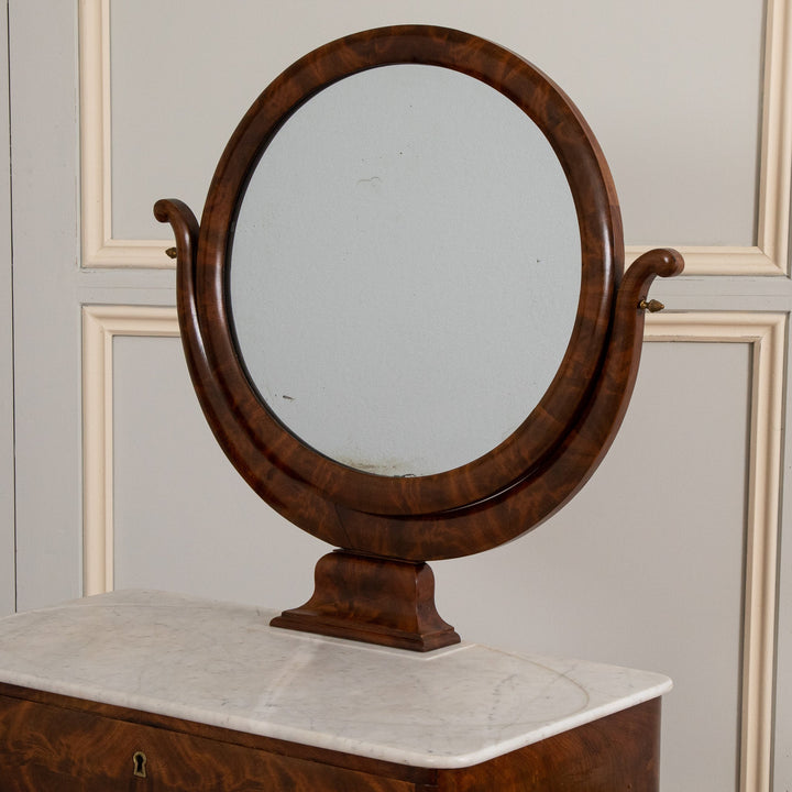 An elegant French Mahogany dressing table from the restauration period (early 19th Century). Seating on 4 Shapely feet has a Marble top with a round Mirror. The drawer has a leather top which was used as a writing table.