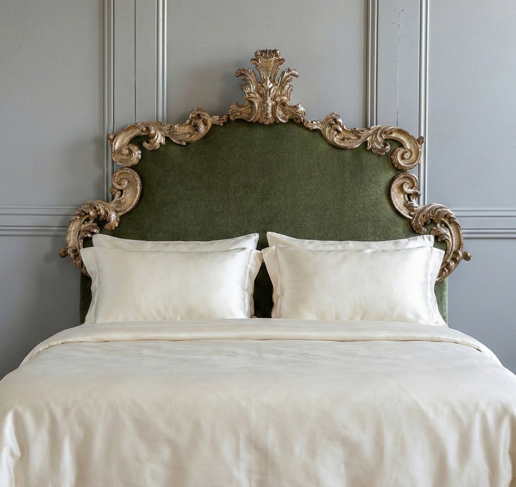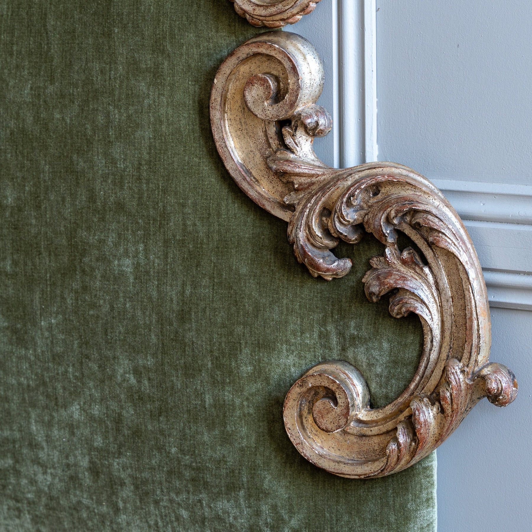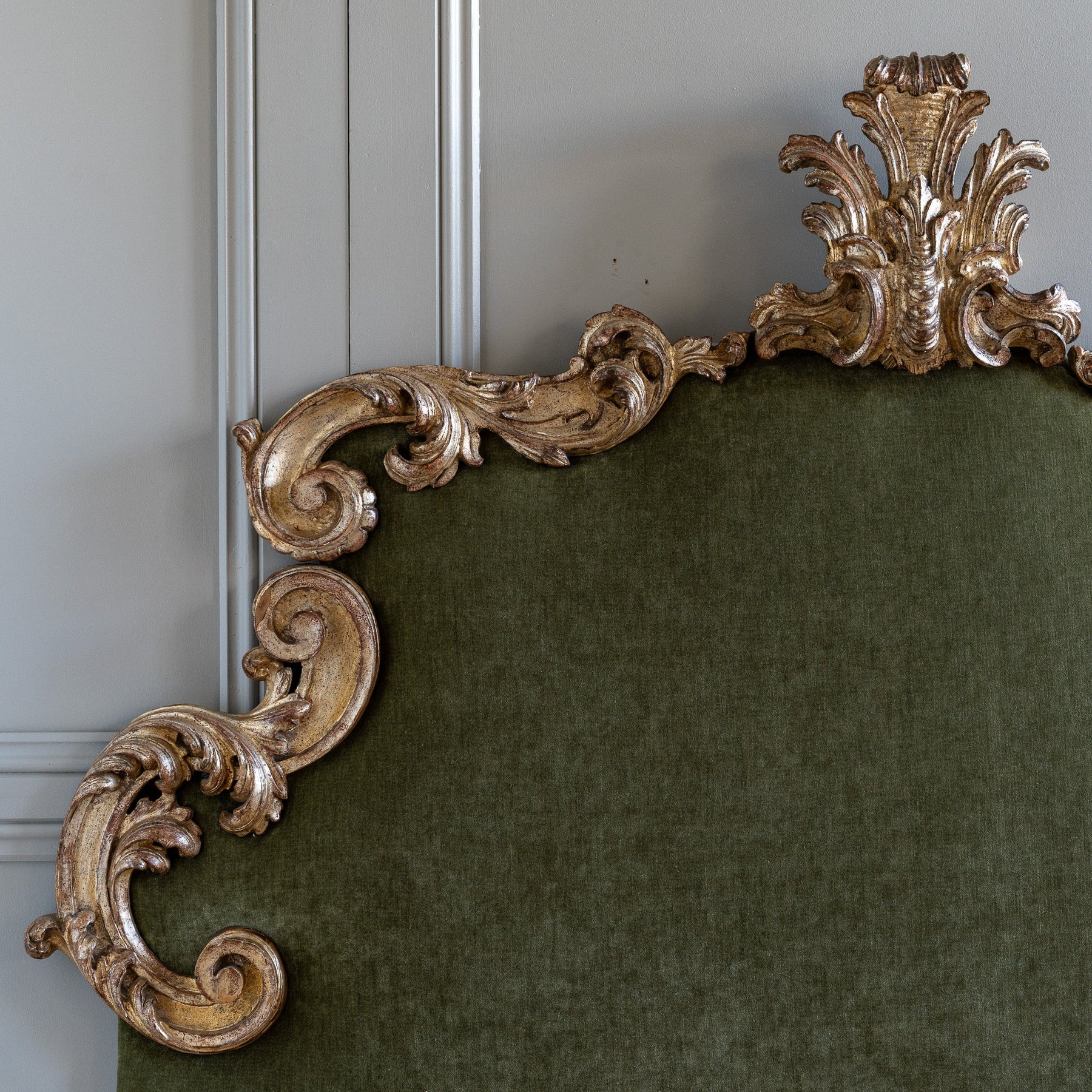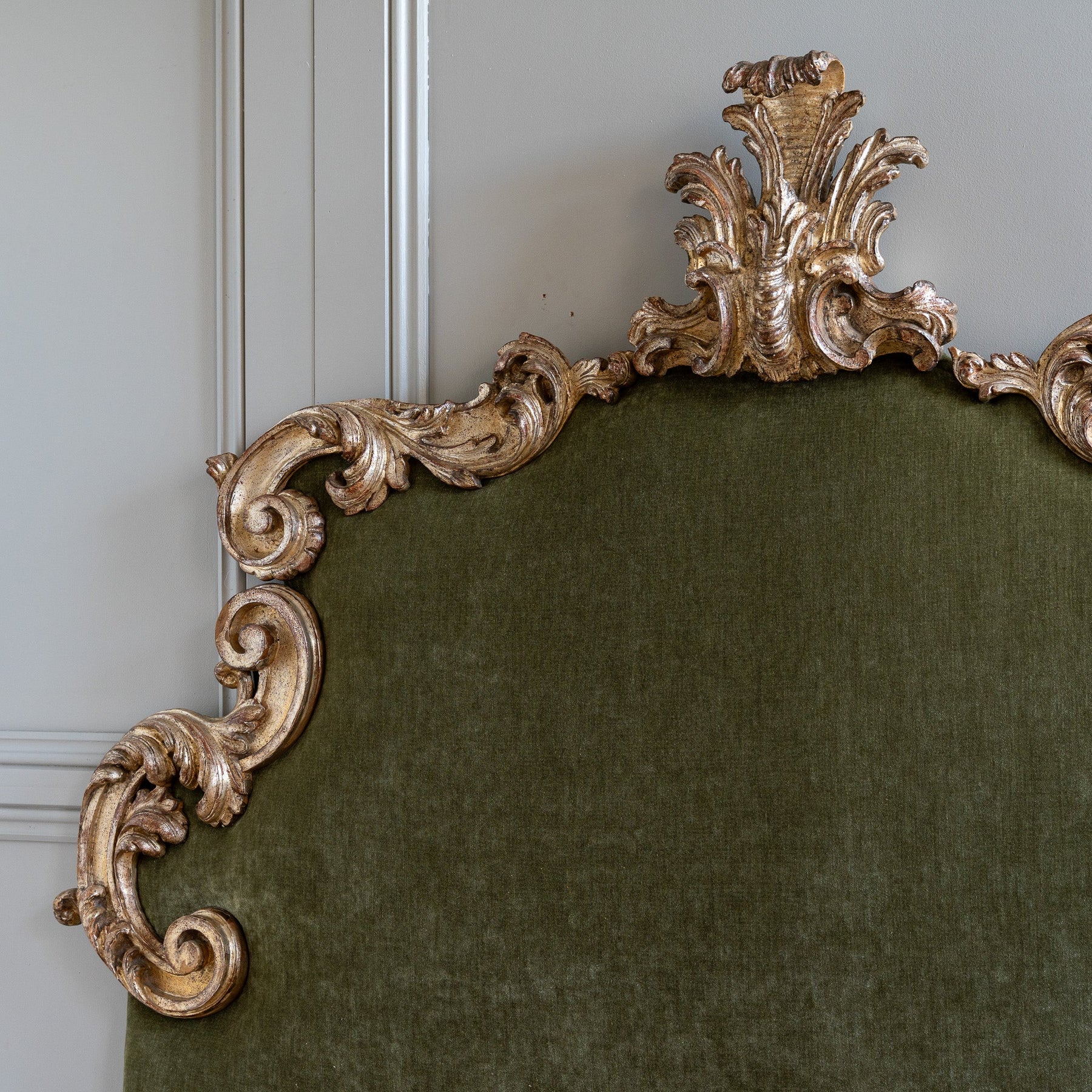 This large Florentine headboard, dating to the early 1900s, captures the ornate elegance of the Rococo period through its sweeping, embellished S-curves and a bold stylised acanthus leaf forming the central crest. The frame is finished in traditional Italian Mecca silver leaf, a historic technique prized for its distinctive silver–gold lustre. Over time, the patina has aged beautifully, developing a richly textured surface that reveals the layered depth of the finish and enhances the sculptural quality of the carving. The headboard has been newly reupholstered in an elegant silk velvet, whose soft, luminous surface provides a refined counterpoint to the decorative frame, adding warmth and tactility without detracting from the overall form. With an impressive overall width of 190cm, this piece is well suited to larger mattress sizes and reads as both decorative and architectural. Equally at home in classical interiors or contemporary spaces seeking contrast and drama, it brings a sense of Italian craftsmanship and quiet opulence to the bedroom.