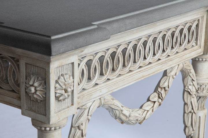 A freestanding console table hand carved in the Louis XVI style with fine, period detailing and hand finished in an aged, French grey patina created using traditional methods and materials. The piece is complemented with a grey stone, beveled top (as seen in pic).