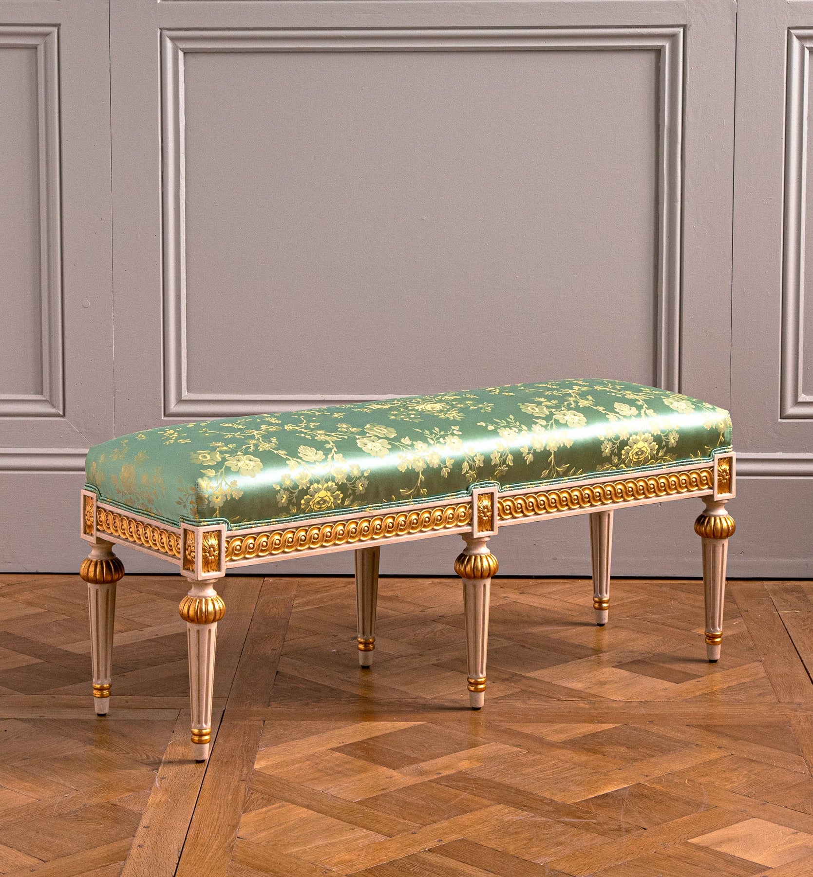 Louis XVI Style polychrome giltwood bench, painted in an Old White with gilded highlights and upholstered with a Tassinari and Chatel Fabric.