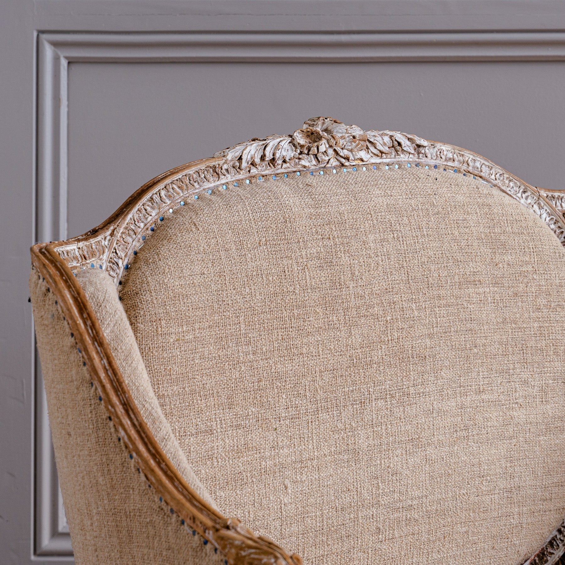 Retaining traces of its original gesso patina, softly aged to reveal the warm wood tones beneath, the piece is a graceful testament to the quiet beauty of handmade pieces that last the test of time. Recently upholstered in natural, organic fabric with traditional upholsterer’s nails.