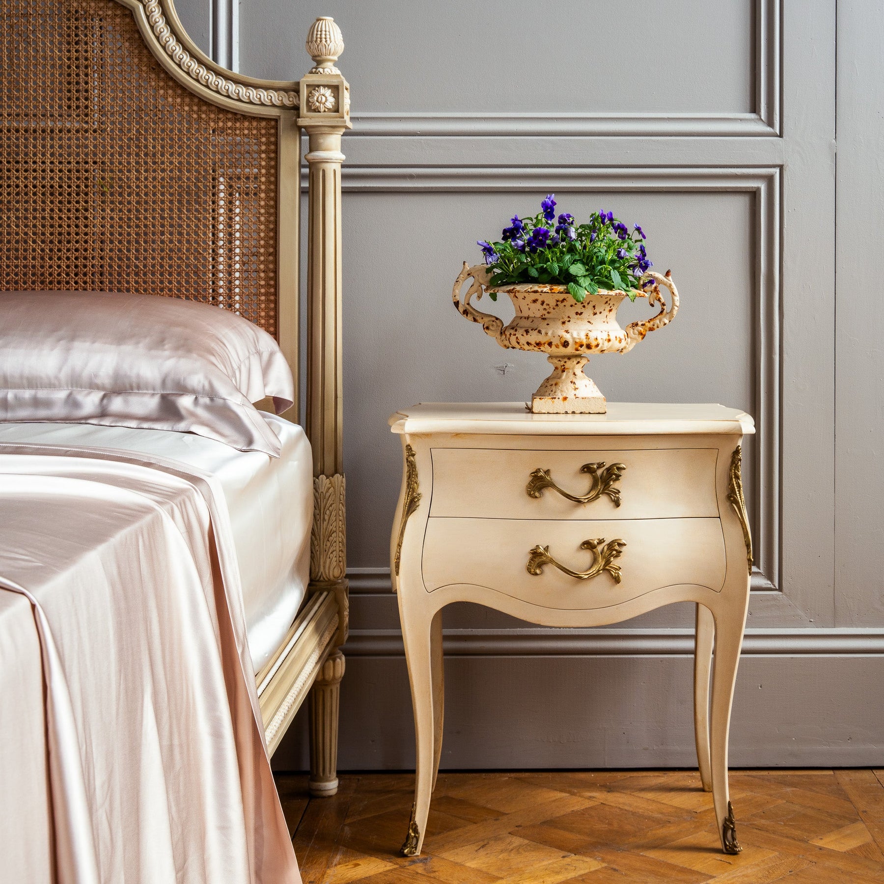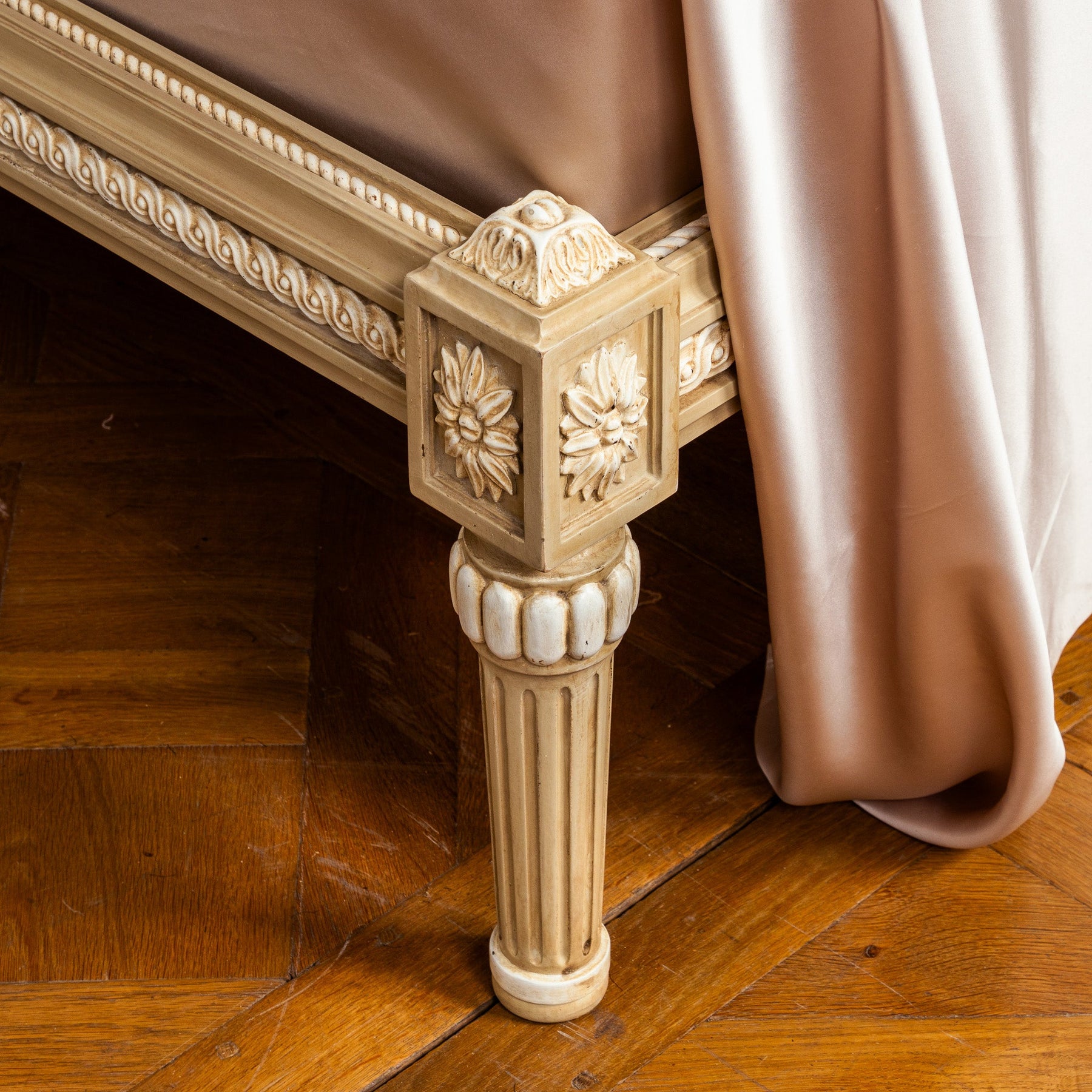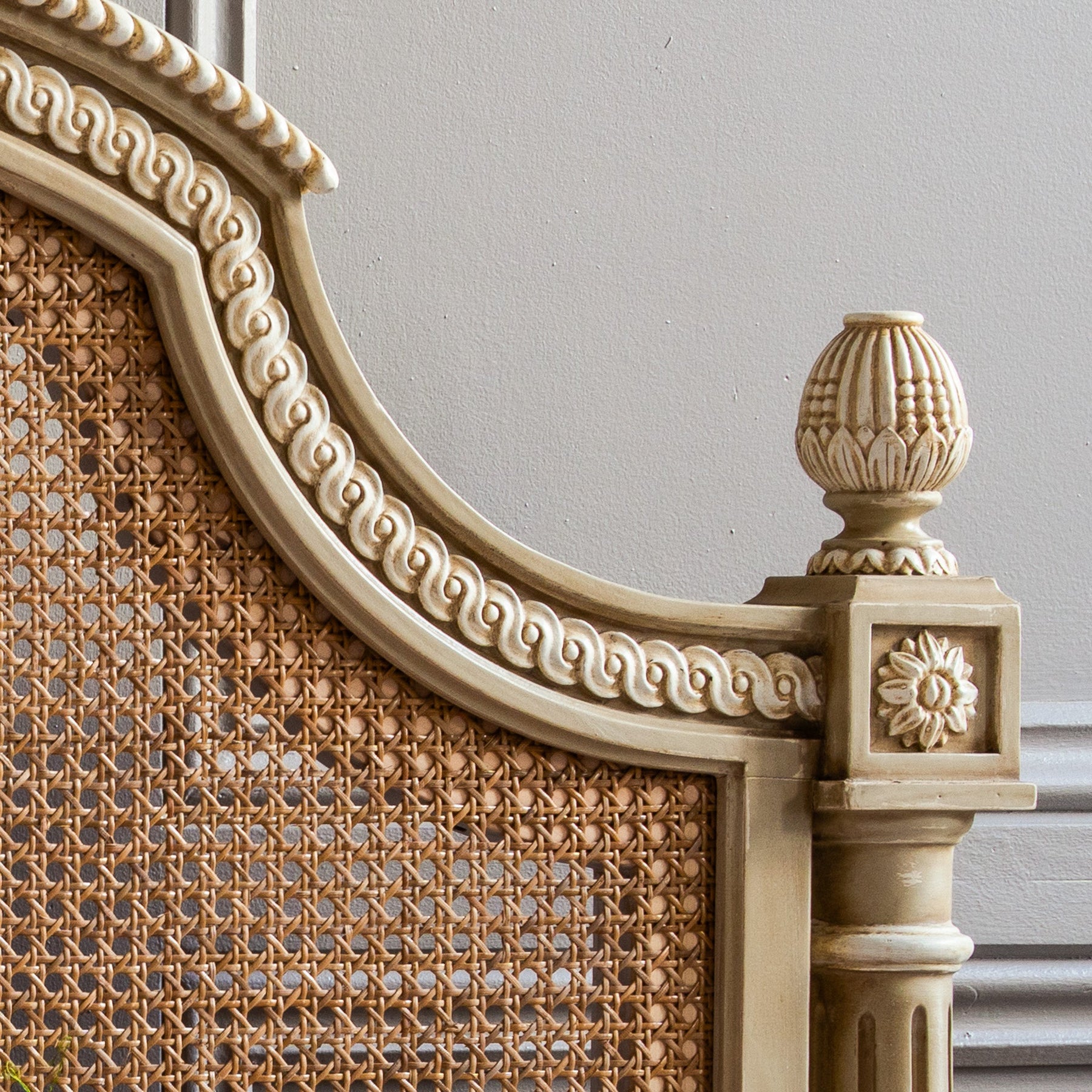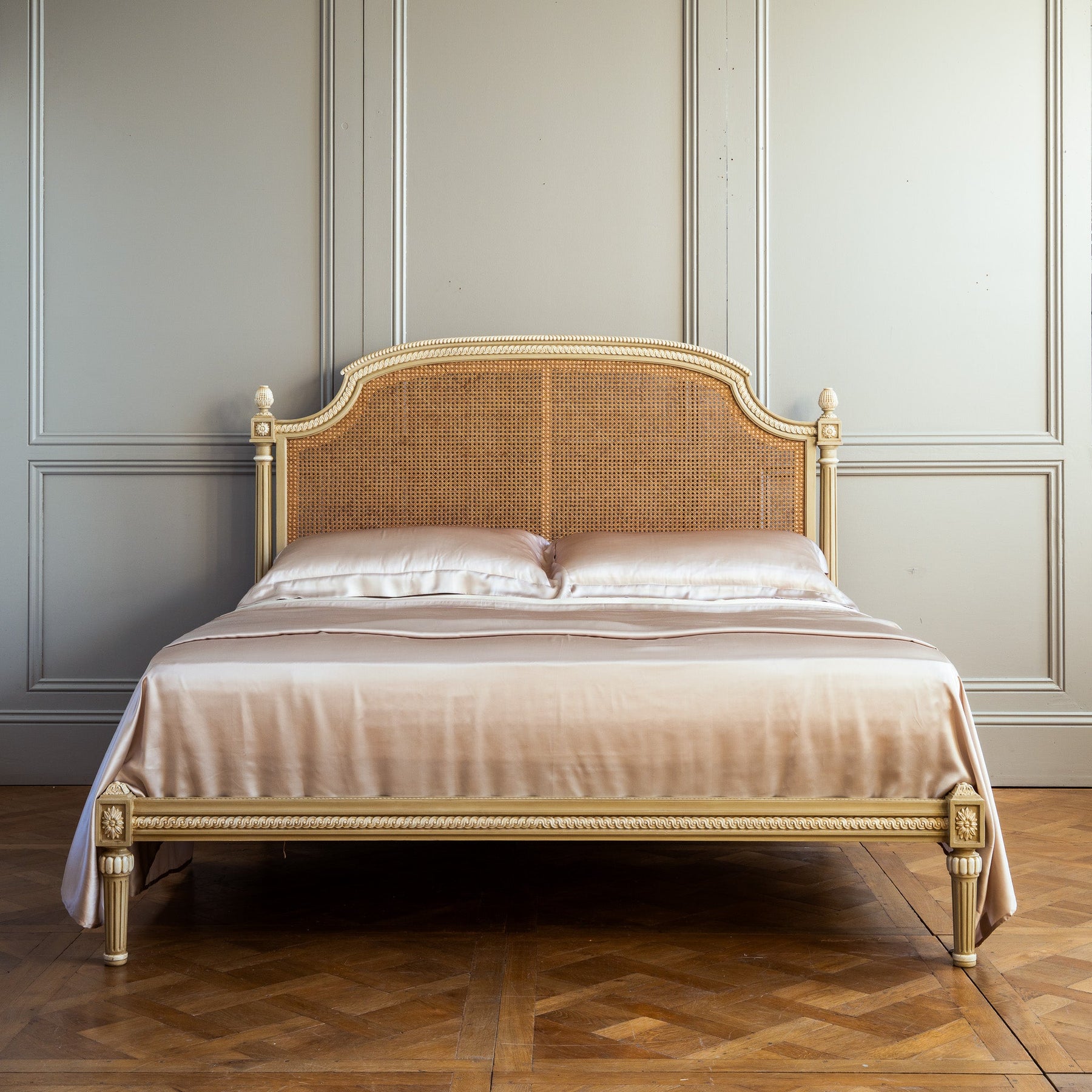 Le lit Rosace est un élégant exemple du style français LXVI. Avec ses colonnes classiques et son ornementation sobre, il se dresse haut et dégage une noble assurance. Le sommet de la tête de lit est orné d'une rosace minutieusement sculptée, flanquée de feuilles de laurier, symbole d'honneur.